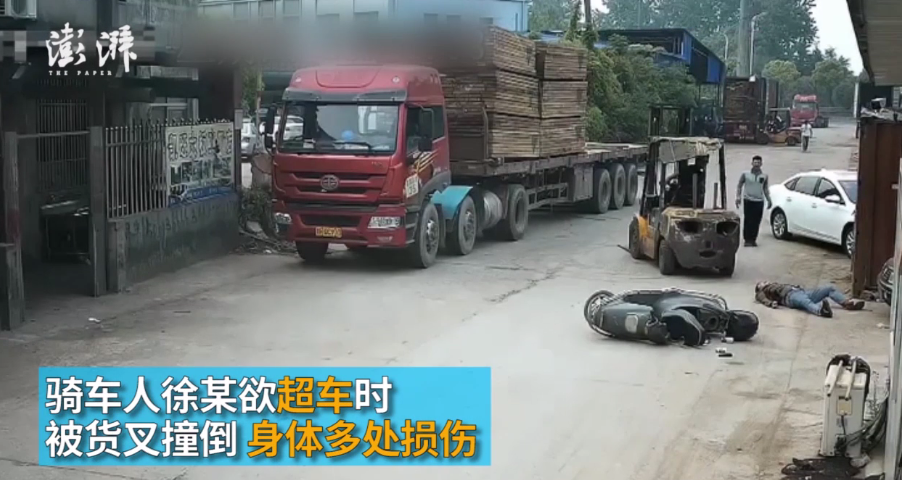 江苏张家港。男子徐某骑车试图绕过一辆叉车时,不料叉车突然转头,被货叉平削面部,摔倒在地。徐某的16颗牙不同程度脱落和碎裂,身体多处骨折。