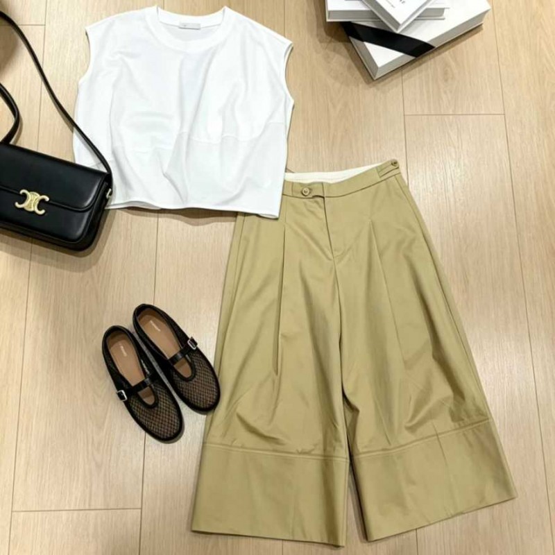 » 白色无袖体恤衫搭配卡其色七分短裤子夏季女装时尚优雅