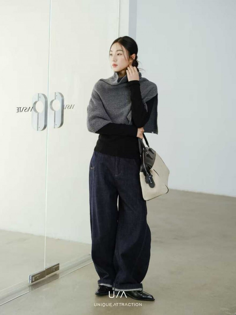 灰色毛衣搭配黑色内搭配上宽松牛仔长裤手提包尽显青春活力