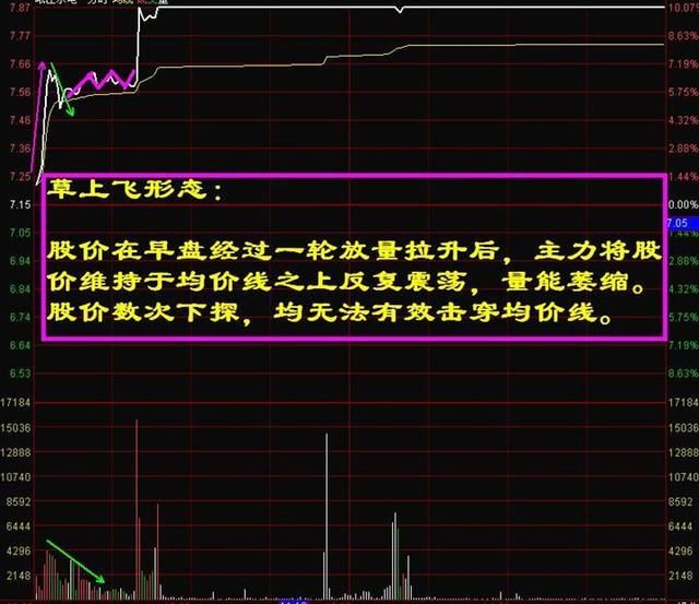 股价早盘的时候经过了一轮放量拉升之后,主力将股价维持到均价线之上反复的震荡,量能萎缩。股价经过数次的下探,都不能有效的击穿均价线,因此就形成了“草上飞”的走势了。当股价回调到均价线多次破时,这时候就可以买进了
